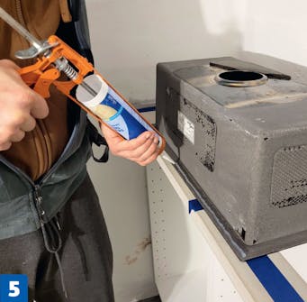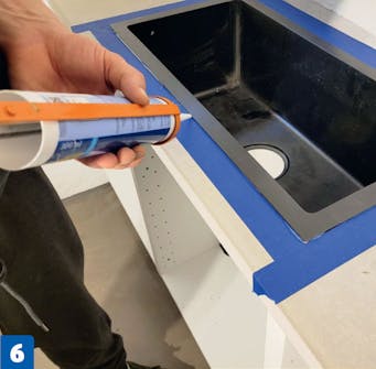 Læg en silikonefuge (her omkring vasken). Fugen skal sikre, at barriererne slutter helt tæt med bundpladen. Fug tilsvarende, hvor bundpladen møder vægge og skabe, men undlad at fuge i renden forrest.