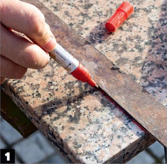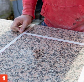 Markér tydeligt, hvor der skal skæres. Her kan en rød tusch eller lignende være at foretrække, da blyantsstreger kan være svære at se på en granitplade som denne.