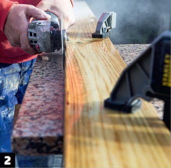 Spænd et bræt fast med to tvinger, og brug det som land, når du skal skære. Hæld godt med vand på pladen, og skær dernæst en rille i granitpladen, så du har noget at skære efter, når brættet fjernes.