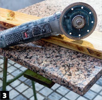 Det første, vi skal, er at skære en granitplade til i længden. Hvis pladen skæres over med en vinkelsliber, som holdes i frihånd, men styres ved hjælp af et bræt, så kan det sagtens lade sig gøre at lægge et snit, der er acceptabelt. Hvis snittet skal være synligt, så skal det renses op, men skal det skjules af en liste, behøver du ikke andet end at skære.