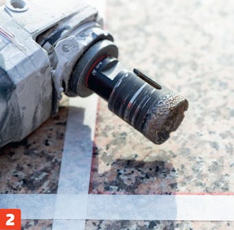 Hulsaven skal holdes vinkelret, så den færdige kant ikke hælder, fordi boret er gået skævt i. For at undgå at brænde boret af skal du bruge masser af vand og holde pauser undervejs. Vi brændte et bor af på tre huller, før vi forstod teknikken.