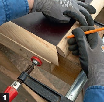 Sæt bundlisterne på. Her har vi vendt hele formen om. Listerne danner over-fladen af hulkelen. Skruerne sættes i en vinkel, så de rammer ned i kvartstaff-listen. Streg borevinklen op på listerne.
