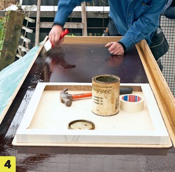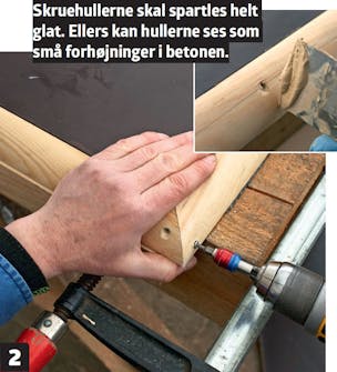 Listerne samles og skrues fast til støbepladen med 4 x 50 mm skruer. Brug lim i samlingerne, og husk at bore for til skruerne. Listerne skrues fast til støbepladen med samme størrelse skruer.
