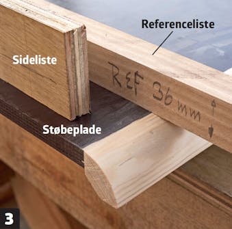 Siderne på formen består af krydsfiner. Når de er skruet fast på siden af støbepladen, skal de rage præcis 36 mm op. Reference listen sikrer, at højden bliver ens overalt.
