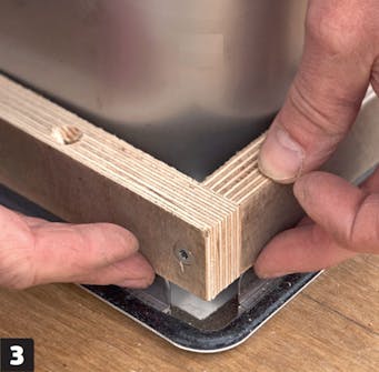 Saml en ramme, der skal skabe forhindringen, som betonen skal løbe udenom. Læg 22 mm krydsfinerliste helt tæt om kring vasken, og skru den sammen med 4 x 40 mm skruer.