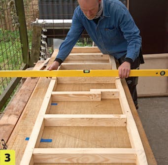 Skru bundlisterne fast i den vinkel, du har streget op. Brug 4 x 40 mm skruer. Skru herefter en skrue lodret ned igennem bundlisten og ned i siderammen, så hele formen hænger sammen. Fjern afstandsklodserne.