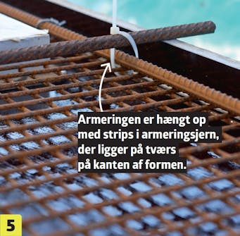Løft armeringen op. Den skal være placeret midt i formen og med et par centimeters afstand til siderne, så armeringen ikke bliver synlig.