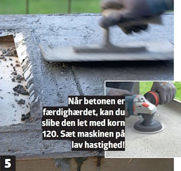 Vip bordet, og vær kreativ: Montér fx en kraftig bolt i en slagskruemaskine, og slå på formens kanter med den. Træk overfladen af med et langt bræt i zigzagbevægelser. Al luft skal slås ud af betonen.