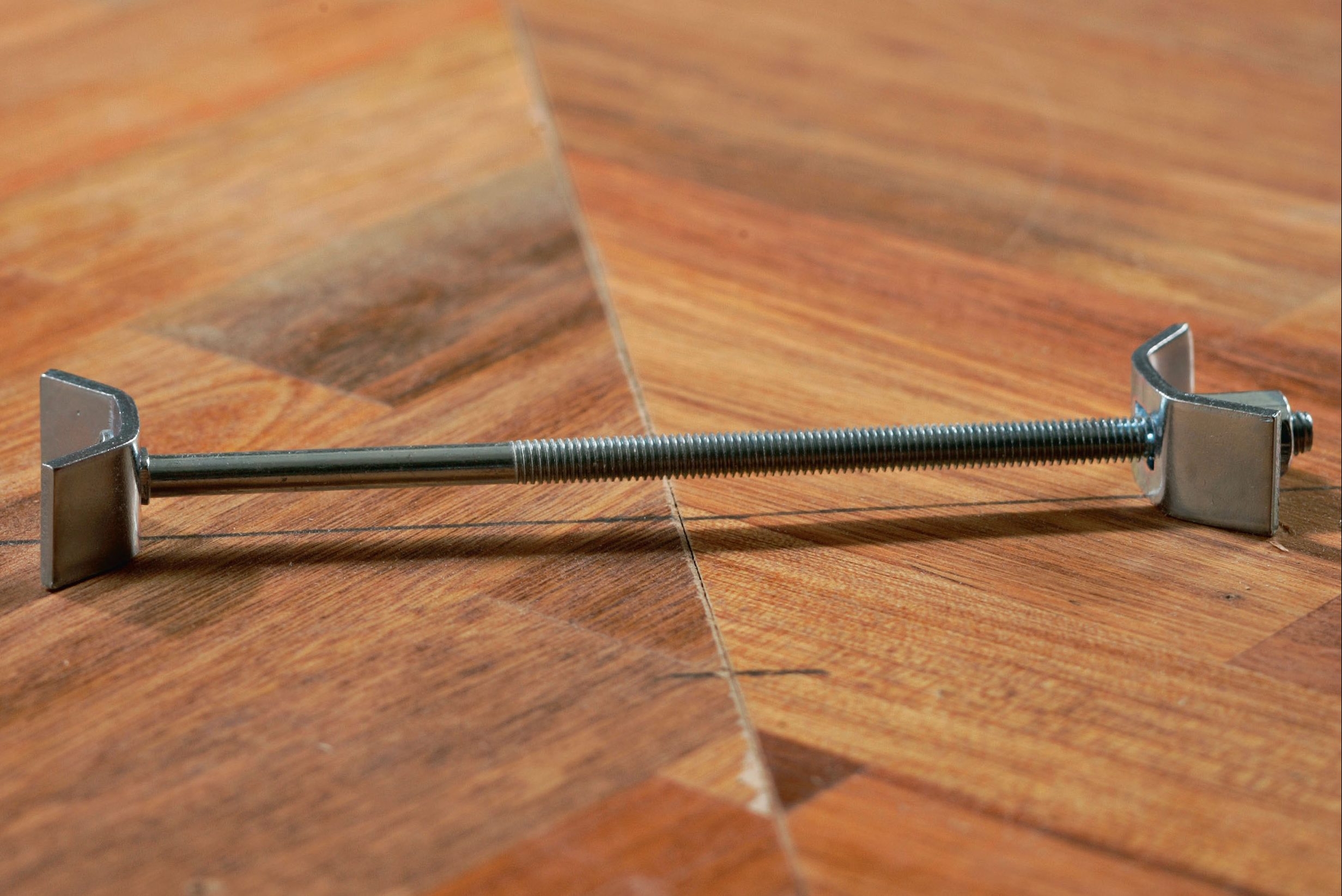 Hullerne bagtil skal passe til skruernes tykkelse, men fortil skal hullerne være ovale, så pladen kan arbejde. Ellers risikerer du, at den begynder at bue, fordi træet udvider sig og trækker sig sammen, når luftfugtigheden svinger.