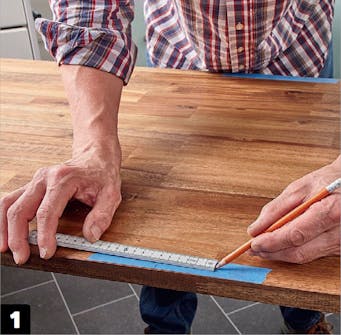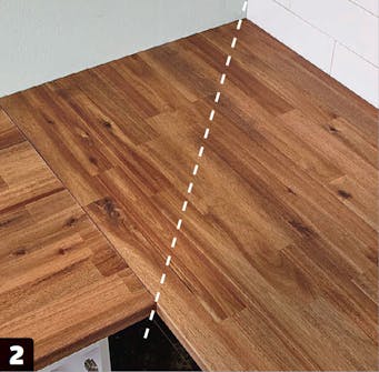 Placér bordpladerne på køkkenskabene, så du kan tegne helt præcist op til det skrå snit. Det skal gå fra hjørnet frem mod den forreste kant på den bordplade, der støder op til den, der ligger op til hjørnet.