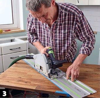 Det kan også lade sig gøre at save et hul i bordpladen til vask eller kogeplade med en dyksav og føringsskinne.