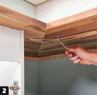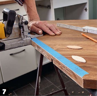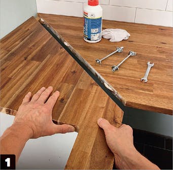 Nu kan du komme i gang med at montere bordpladerne. Sæt først fladdyvlerne på plads i de fræsede riller, og læg så de to plader oven på underskabene. Der skal vandfast lim på de skrå snit, inden du presser pladerne godt sammen.