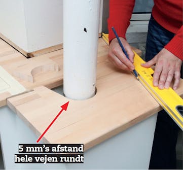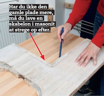 Hvis du ikke har splittet den gamle bordplade til atomer, da du tog den af, er den perfekt til at strege op efter. Læg den oven på den nye plade, og streg op, hvor der skal saves. Slå et kryds på det, der skal væk, så du ved, hvor du skal bore for, hvis det er nødvendigt for at få saven i, fx ved udskæring til vask.