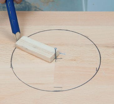 Læg bordpladen på et par bukke, og lav en ny streg ca. 1 cm inden for stregen rundt om kanten. Tjek det præcise mål på vaskens flange, mindst halvdelen af den skal kunne hvile på bordpladen.