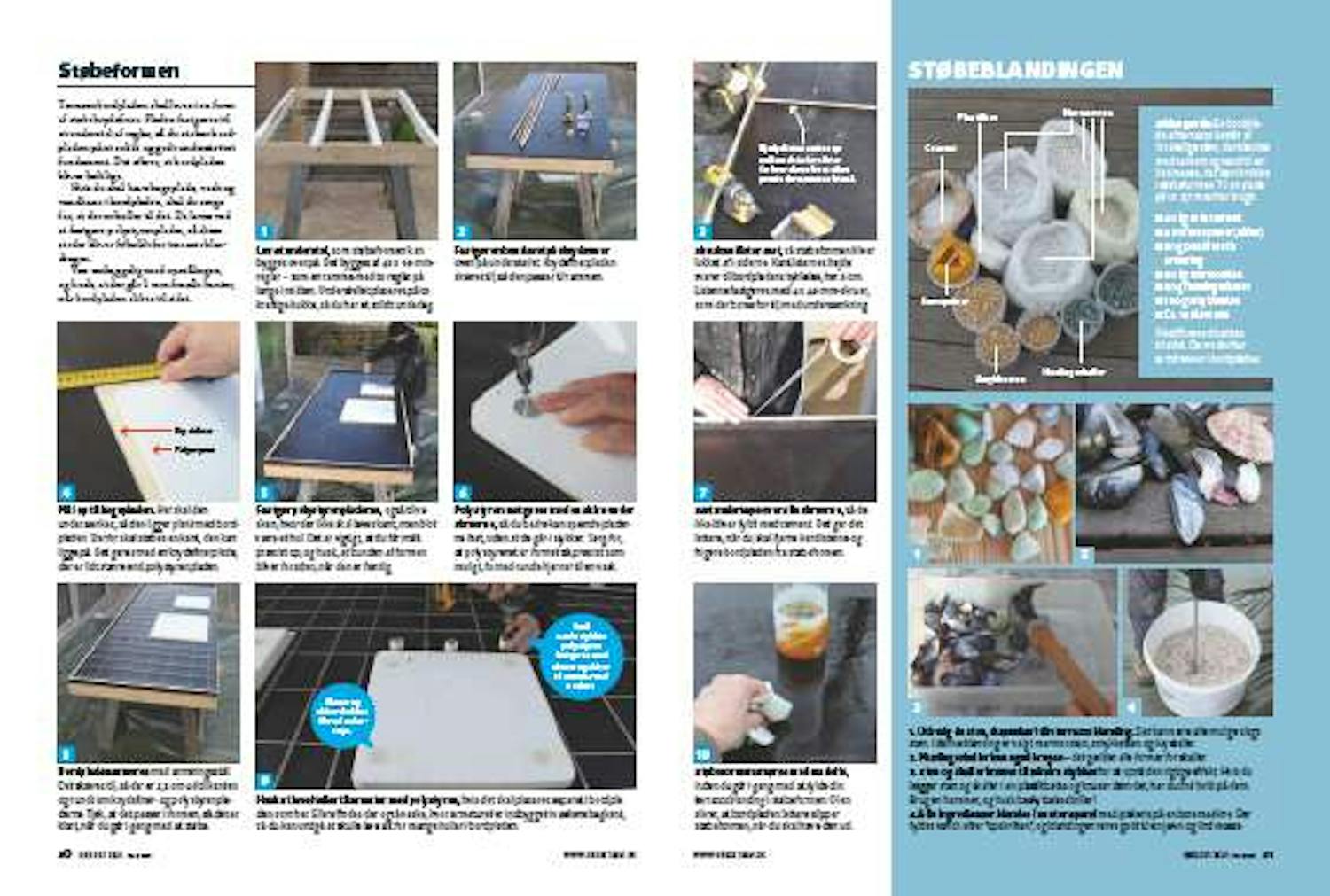 Det er vigtigt, at støbeblandingen presses så godt ned i formen som muligt. Det gælder nemlig om at undgå lufthuller i støbeblandingen - det vil svække bordpladen. For en sikkerheds skyld bør du lige vibrere støbeformen grundigt, inden du dækker den til og lader den stå og tørre et par uger, til pladen er hærdet.