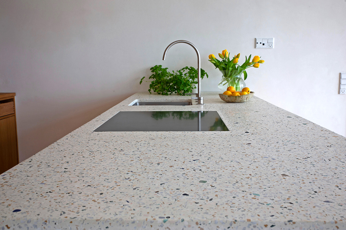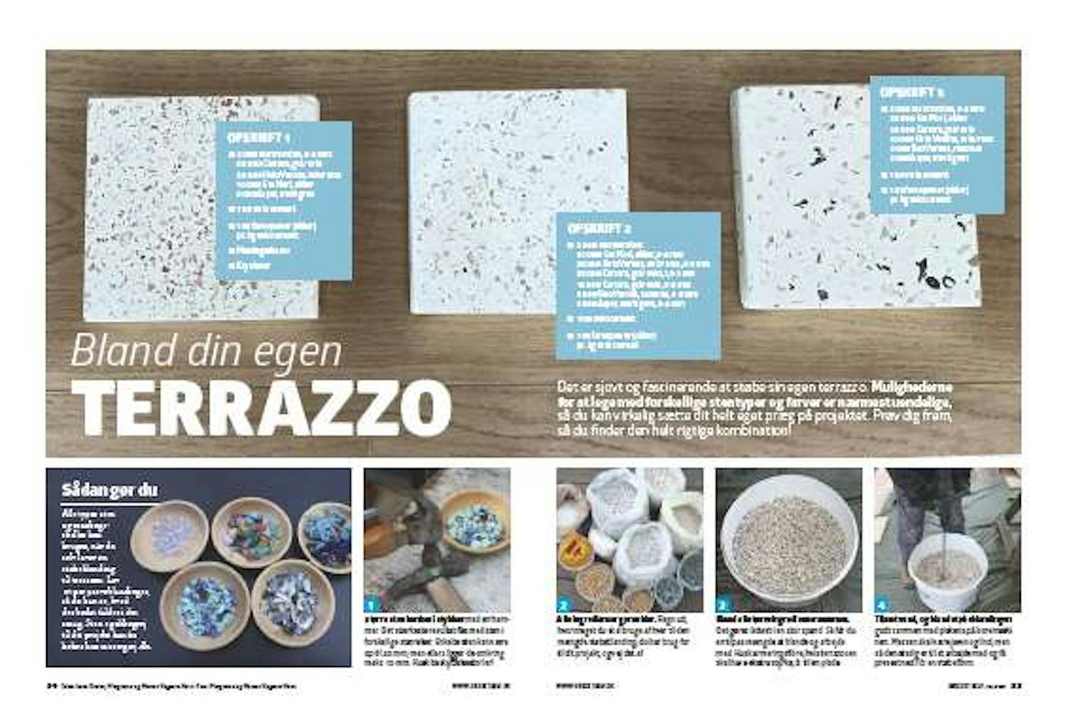 Det kræver tålmodighed at lave sin egen terrazzoblanding og grundighed at støbe den og slibe overfladen glat og lækker.