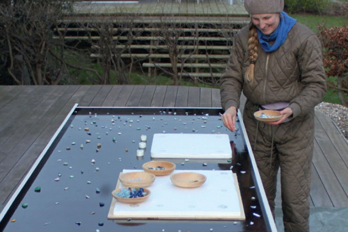 Større sten og skaller lægges ud på støbeformen, inden støbemassen hældes ned i formen. Disse sten og skaller bliver ekstra tydelige, da pladen jo vendes, når den kommer ud, så bund bliver til top.