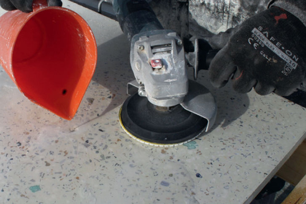 Bordpladen vådslibes med vinkelsliber og diamantslibeskiver i tre forskellige grovheder. Start med den groveste, derefter den mellemste og til sidst den fineste - så får du en glat og blød overflade. Vand hældes på løbende, mens du sliber