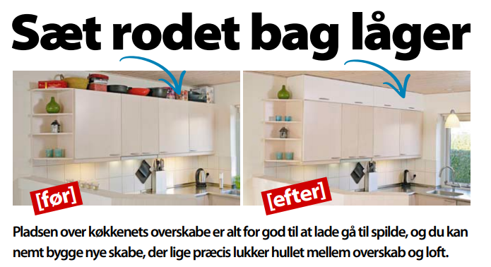 TIPS: Er loftet glat, kan du lukke af mellem skab og loft med akrylfuge, men det vil ikke være pænt ved listeloftet her.