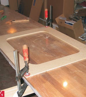 Bordpladen lægges på et par bukke med oversiden opad. Skabelonen placeres, hvor vasken skal sidde, og spændes fast med tvinger, så fræseren (skubbes imod rotationsretningen) har fri passage.