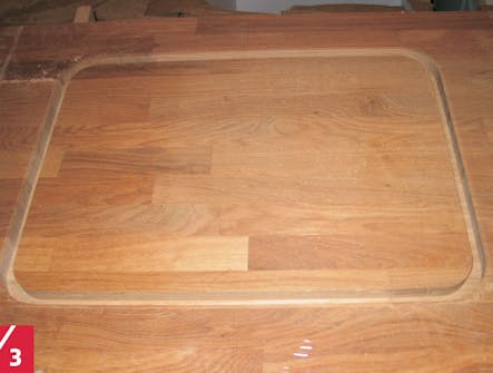 Når du skal fræse hullet til vasken, skal du bruge en kopiring til din fræser samt en skabelon, som via kopiringen kan styre fræseren. Da skabelonen er altafgørende for det færdige resultat, må du ikke springe over, hvor gærdet er lavest. Skabelonen til Jan Buchholdts projekt er lavet af en 10 millimeter spånplade, men du kan sagtens bruge andre træplader - mdf eller hård krydsfinér.