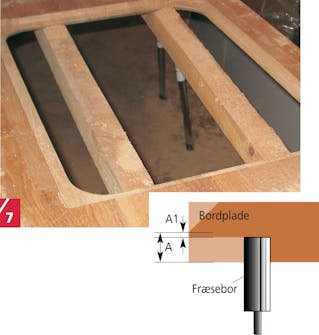 Hvis fræseboret ikke kan nå igennem pladen, fræses fra bagsiden. Det efterlader selvfølgelig en kant, da du ikke kan komme til at montere skabelonen nøjagtig samme sted på bagsiden af pladen. Men det betyder ingenting for det færdige resultat.
