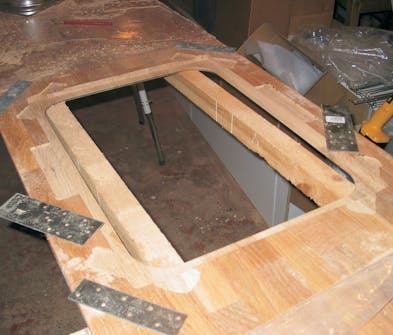 Efter den første fræsning står du med et hul i bordpladen, svarende (forhåbentlig) til vaskens inderkant. Siderne i udskæringen er ret op og ned og skal nu bearbejdes, så du får den skrå kant.