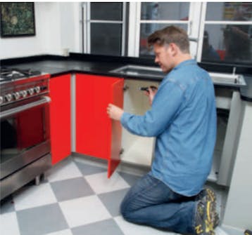 Først skrues grebene af lågerne. Det går hurtigt og nemt, når lågerne stadig sidder på skabene. Tjek, om der er låger, der hænger skævt, og køb nye hængsler til dem. Eller skift dem alle.