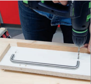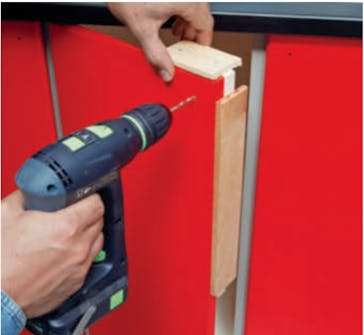 Hold boreskabelonen (koen) ind på lågen, og bor huller til håndgrebene. Da listerne rager ud på begge sider af pladen, kan skabelonen anvendes til både venstre- og højrehængte låger.