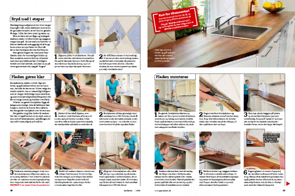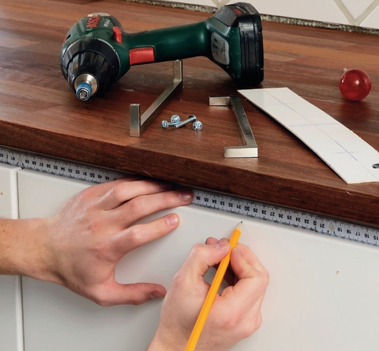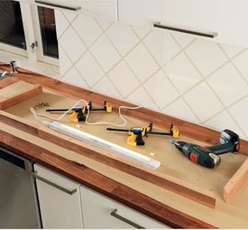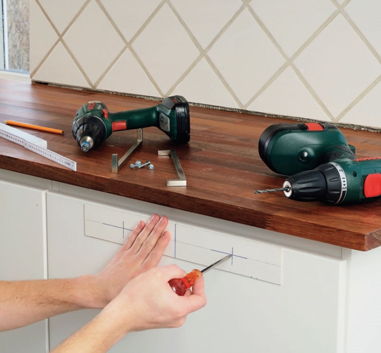 Den nye plade lægges på plads og skrues fast til skabene gennem vinkelbeslag. Brug små “riglejern”, som gør det muligt for bordpladen at arbejde i bredden foran, mens den ligger fast bagtil.