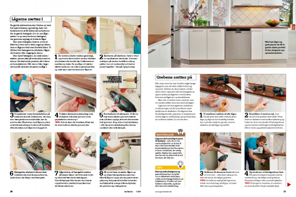 Den del af hængslet, der skal sidde i skabet, skrues fast på indersiden med to skruer. De skal sidde præcist, så vi laver en boreskabelon. Når den er klar, tager det kun få minutter at sætte en låge i.
