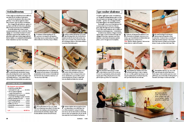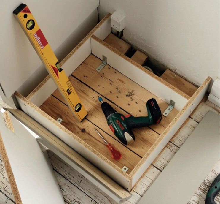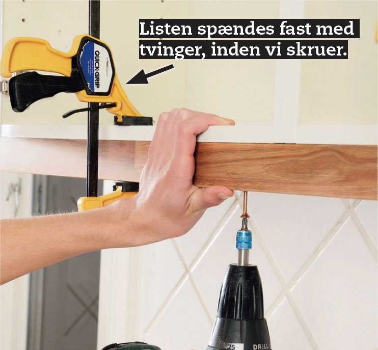 Den forreste liste skruer vi fast under skabene med 4 x 50 mm skruer. Vi borer for og forsænker, så skruehovedet skjules pænt. Pas godt på, at skruerne ikke går for dybt og prikker hul i indersiden.
