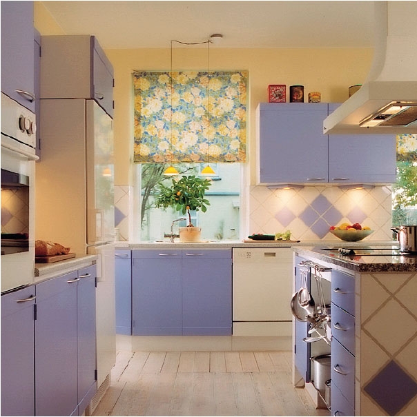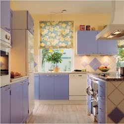 1992: Vi er fremme ved 1992, og her sker en langt større ændring. Man river væggen ind til stuen ned og skaber detalrum med køkkenø, der hører den moderne familie til: Køkkenet er ikke en hjemme gående husmoders domæne, nu smelter voksnes og børns verden sammen. Elementerne er smarte: De flyttes rundt, og lågerne males blå, ligesom nogle af fliserne over de lyse borde. Det hele kranses af gyldne vægge og spraglede gardiner.