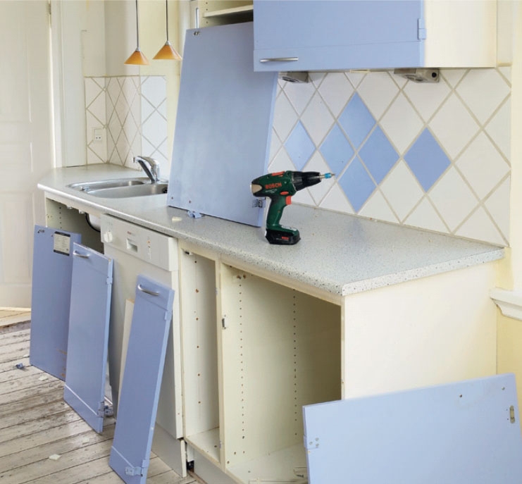De tomme skabe vaskes grundigt, og skruehullerne lukkes med en slibefast akrylmasse eller kemisk træ. Småskrammer spartles og males. De nye låger vil næsten dække kanterne, men det er pænest at slibe og male dem i samme farve som lågerne.