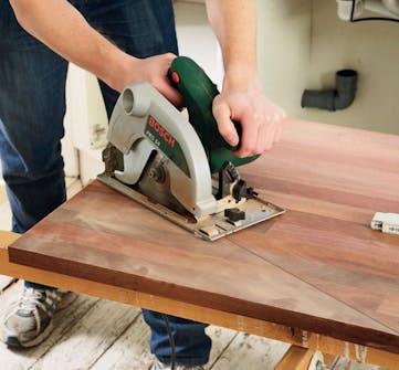 Snittet til det skrå hjørne, som bordet er nødt til at have af hensyn til en dør, saves af med en rundsav. Vi kan overføre målene fra den gamle bordplade, der stadig sidder på skabene ved siden af.