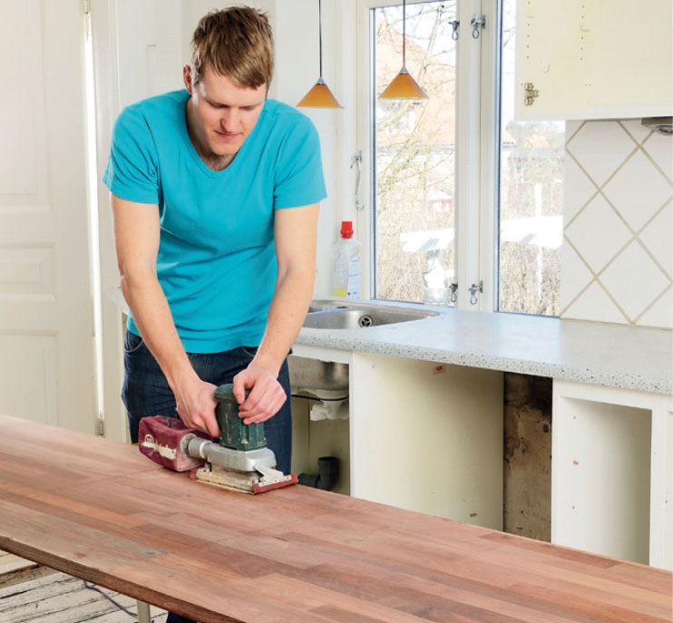 Bordpladen slibes grundigt med sandpapir korn 180. Hvis den skulle få lidt knubs under det næste arbejde, er det nemt rettet op igen - nu udnytter vi, at vi nemt kommer til på de regulære flader.