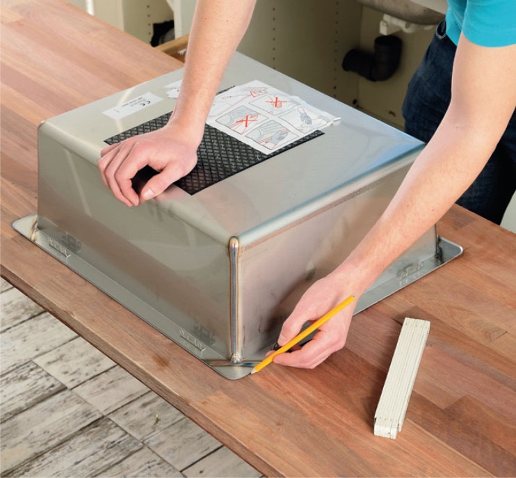 Vaskens omrids streger vi af, hvor den skal placeres. Så fjernes vasken, og en ny streg trækkes 7 mm inden for vaskens omrids - se i vaskens monteringsvejledning, hvor meget der skal trækkes fra for din vask.