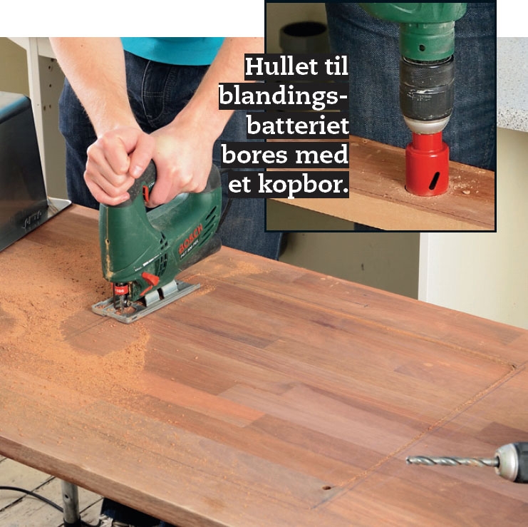 Hullet til vasken skærer vi med vores stiksav. Først bores et 10 mm hul lige inden for stregen, som klingen kan stikkes ned gennem. Bagefter bores hullet til blandings batteriet - placeringen finder vi med vasken lagt løst i hullet.