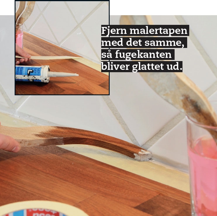 Fugen mellem bordpladen og fliserne skæres rent af med en skarp kniv. Brug ikke silikoneløsner, for hvis der sidder den mindste rest af den tilbage, vil den også løsne den nye fuge.