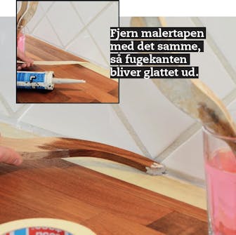 Mellem bordet og væggen lukker vi af med en elastisk silikonefuge. Vi masker først fugen af med afdækningstape og presser et fugebagstop af skumplast ned i fugen, derefter fylder vi op med silikonemassen fra fugepistolen.