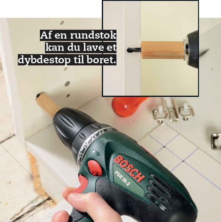 Bor hullerne til skruerne. Hullerne skal bores næsten gennem skabets sider, så det er vigtigt, at boret ikke smutter helt igennem. Brug et bor med dybdestop - eller lav selv et dybdestop af en stump rundstok i den rette længde.