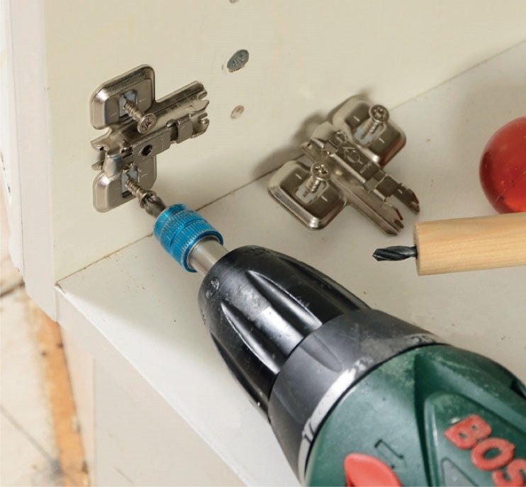 Hængslets skabsdel skrues fast i skabets side med de specielle korte, tykke skruer, der følger med hængslet.