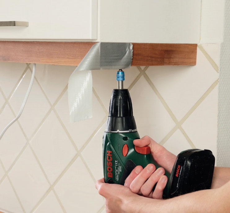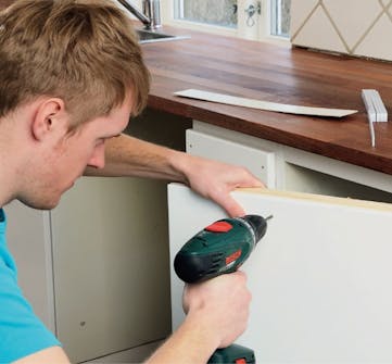 De gamle bordplader løsnes og bæres ud. De er gerne knyttet til skabene med skruer og beslag, som løsnes nedefra. Husk også at skære en eventuel silikonefuge ind mod væggen af, ellers risikerer du, at du river væggens overflade i stykker.
