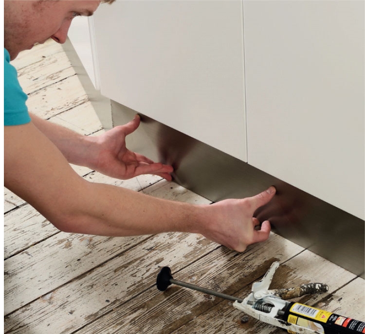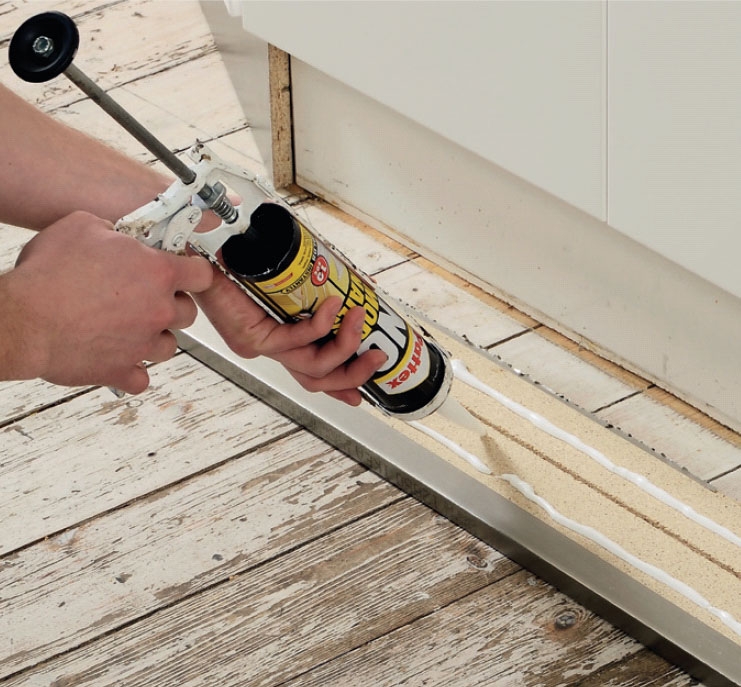Soklen sættes på plads og trykkes fast. Montagelimen har i forhold til en klassisk snedkerlim den fordel, at den kan bære, selv om soklen ikke presses helt tæt på underlaget, så det er ikke svært at få den nye sokkel til at sidde pænt.