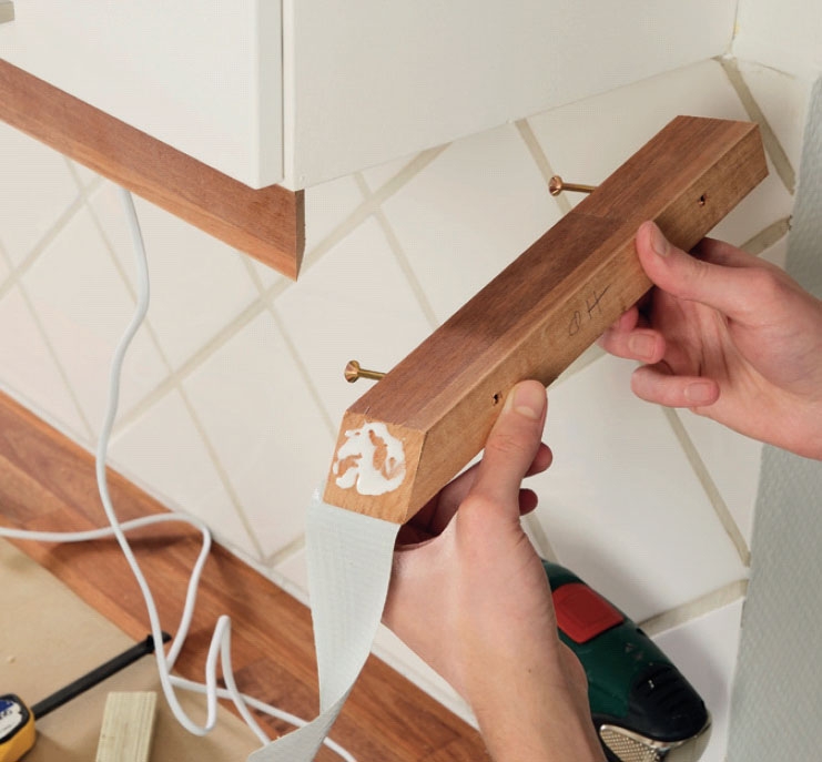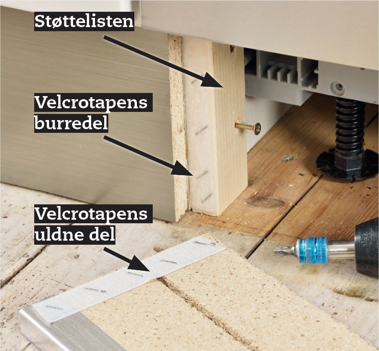 Under opvaskemaskinen skruer vi en støtteliste på naboskabet i begge sider, så sokkelstykket under maskinen får noget at sidde på. Vi sætter velcrotapen på med hæfteklammer - husk plads til tapen, når du måler ud til støttelisternes placering.