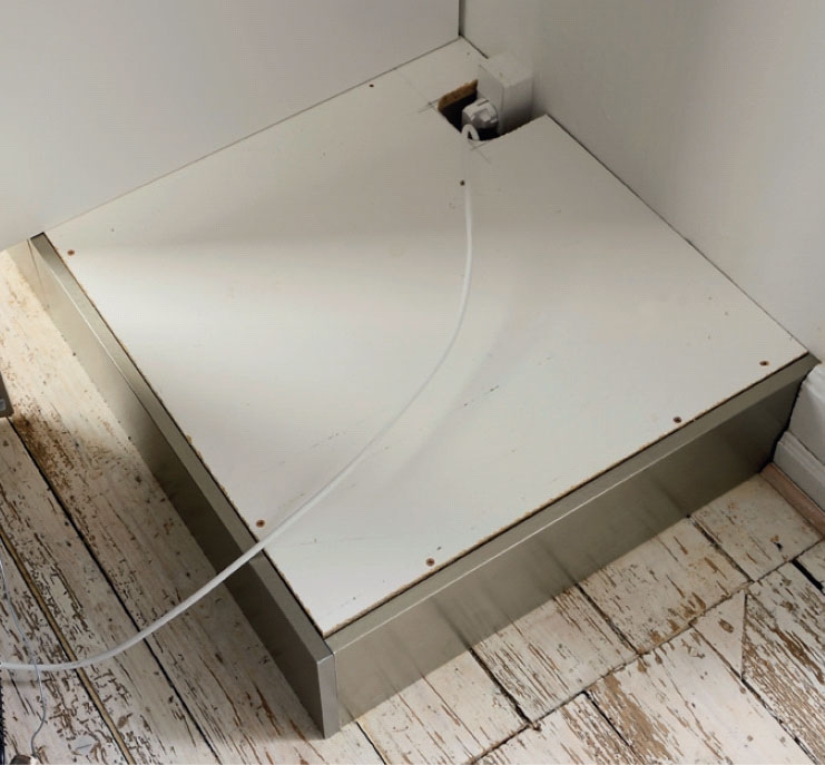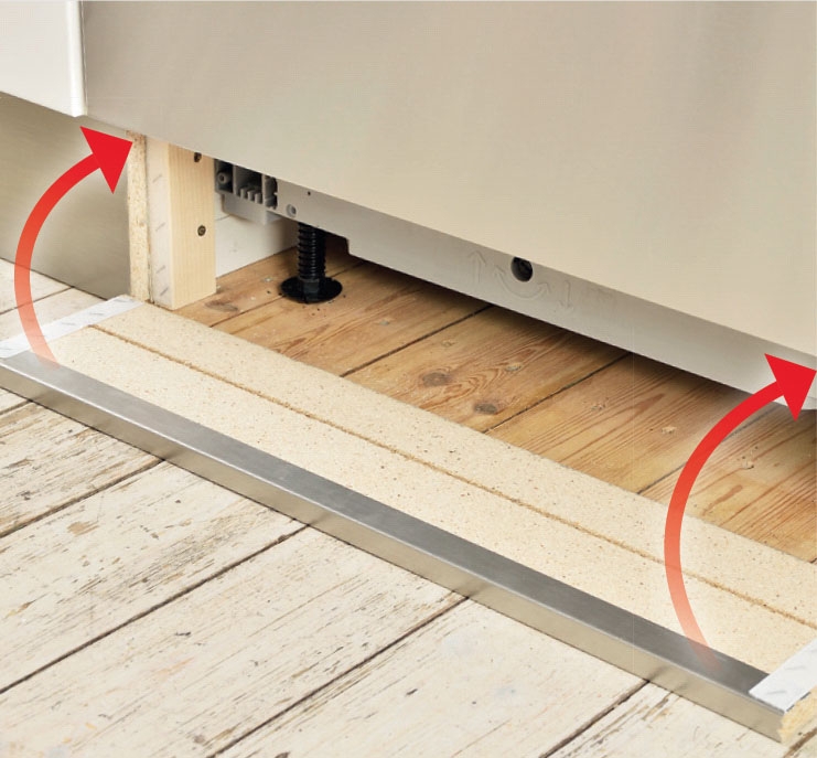 For at få soklen ført videre under opvaskemaskinen må vi trylle lidt. Det er vigtigt, at vi nemt kan komme til under maskinen og nemt kan trække den ud, så soklen skal være lynhurtig at pille af. Derfor hæfter vi et særskilt sokkelstykke foran maskinen op med velcrotape.