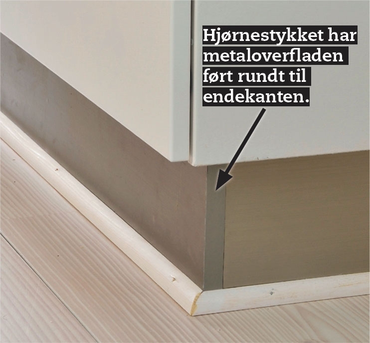 Til det nye køleskab bygger vi en sokkel i samme højde som soklen under skabene. Den er meget enkel, som du ser på billedet, og skrues fast i gulvet med møbelhjørner, så der er plads til at lime de stålgrå sokkelstykker udenpå.