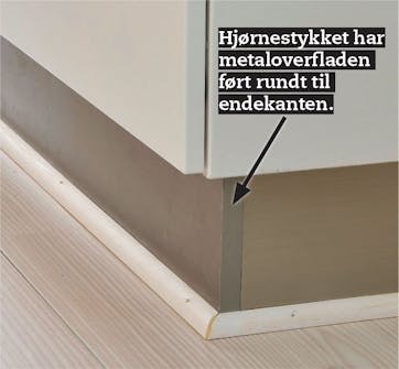 Vi skærer sokkelstykkerne til og smører montagelim på bagsiden. Udvendige hjørner samles på gering, altså skåret skråt, så vi ikke får synlige snitflader.