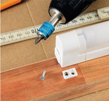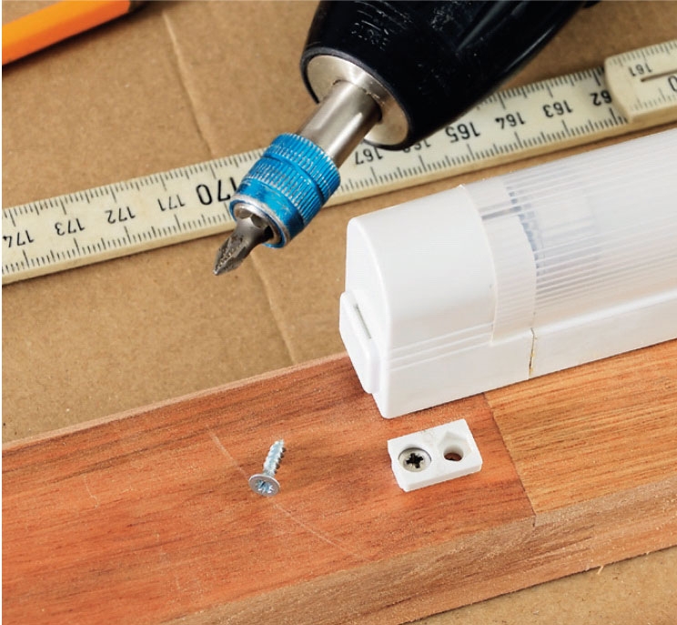 De små beslag til armaturet skrues fast på bagsiden af den forreste liste. Armaturet kan nu skydes på plads på panelets bagside. Vi kan slutte det til den samme kontakt, som de gamle lamper brugte, og klipse ledningen fast.