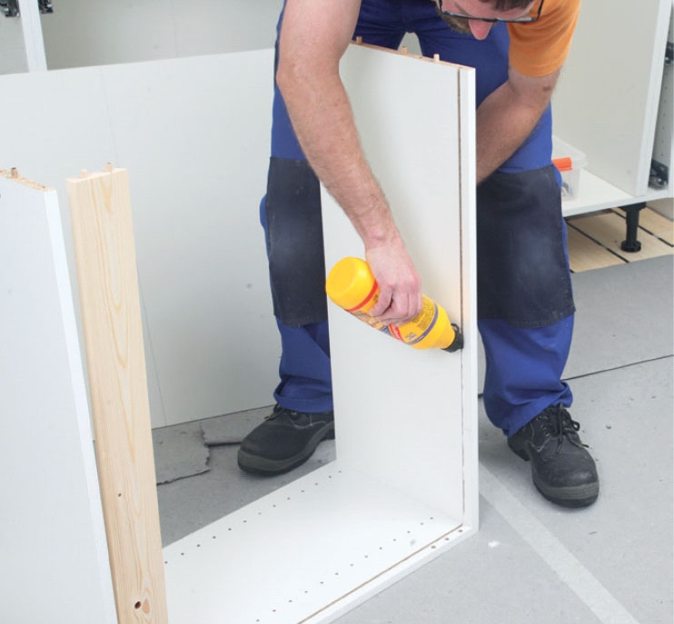I siderne og i hjørnet skal du skabe lidt afstand, så skuffer og skabshåndtag ikke ridser noget, når de lukkes op og i. Det gør du med såkaldte tilsætninger, som du skærer til af samme slags plade, som er brugt til sidepladerne.